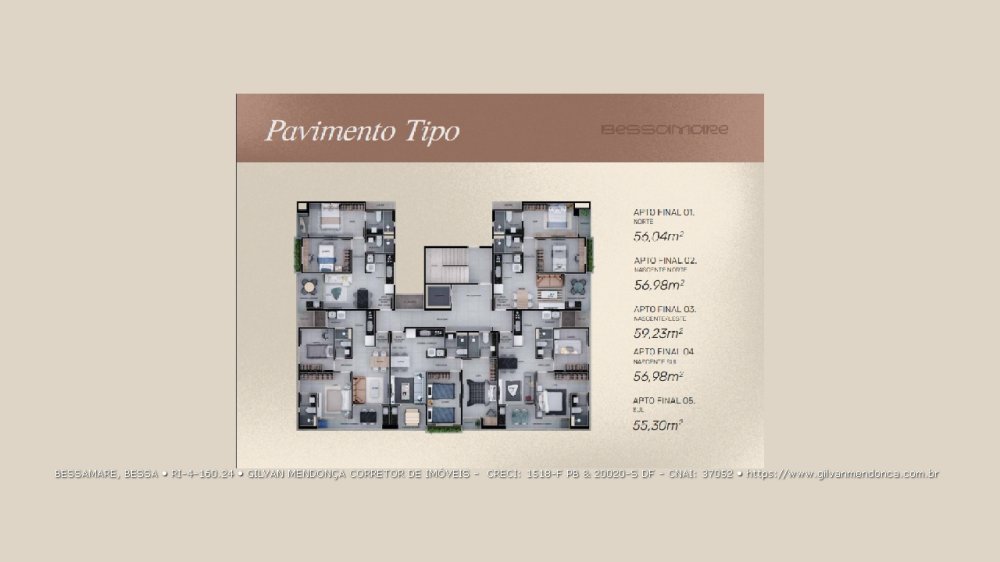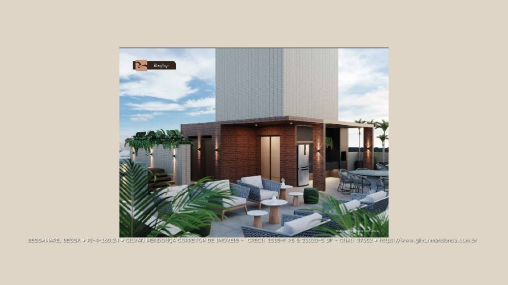 Apartamento final 05, Sul, 55,30m², 2 Quartos (1 Suíte com Varanda), Sala 2 Ambientes, Varanda Gourmet, 2 Banheiros, Elevador, Rooftop, no Bessa em João Pessoa - PB.