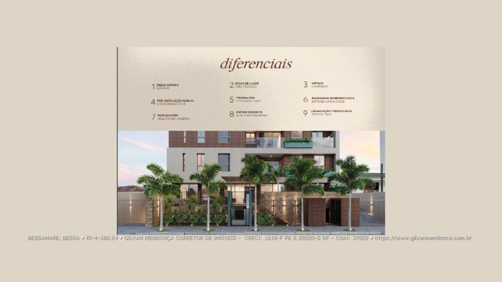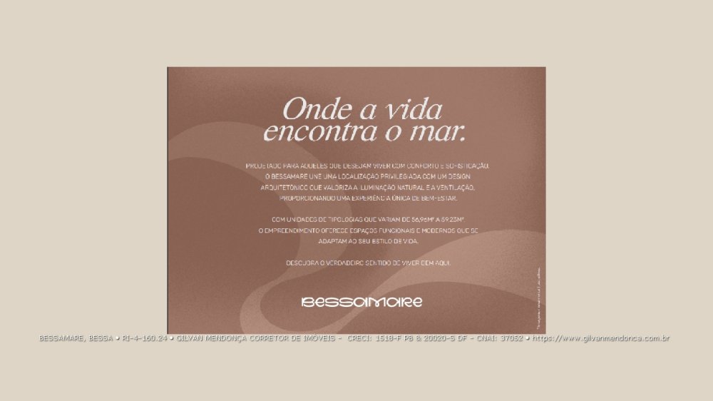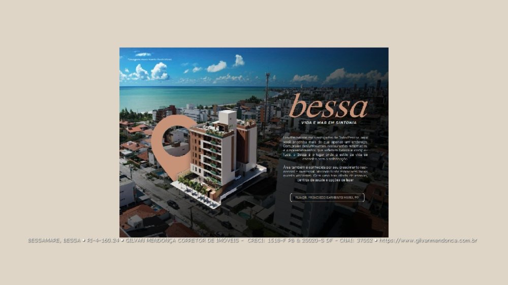 Localizado no bairro mais desejado da capital paraibana, o Bessamare está a apenas 180 metros da Praia do Bessa, combinando conforto, design moderno e uma localização privilegiada. Essa região está em plena valorização, com alto potencial de crescimento imobiliário e inúmeras opções de lazer, cultura e gastronomia. O bairro do Bessa reúne o que há de melhor para morar ou investir, com farmácias, mercados, escolas, bancos, lojas, restaurantes renomados e shoppings por perto.