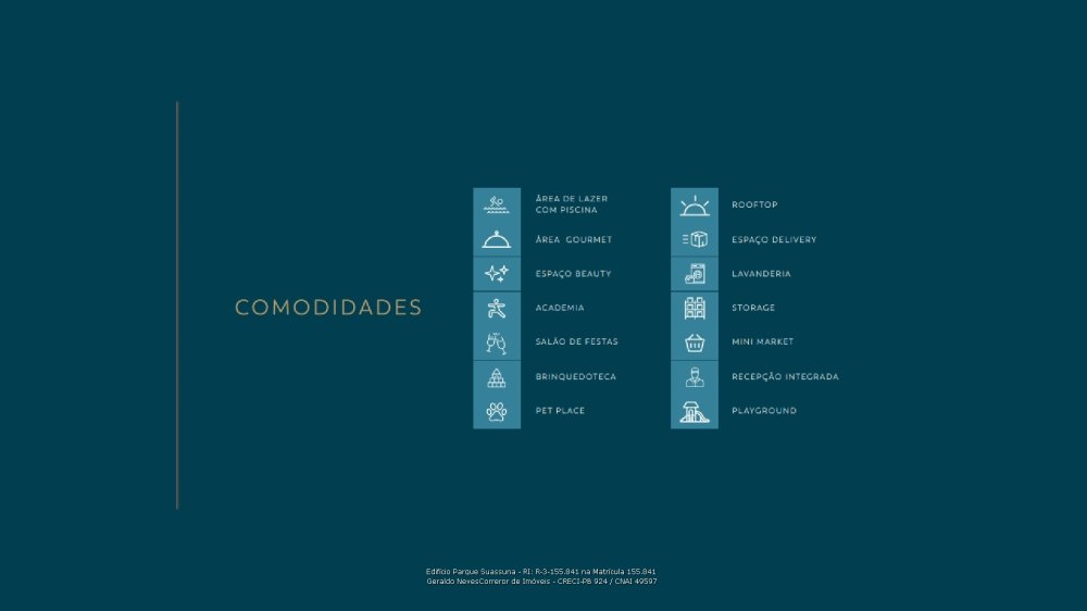 Piscina • Academia • Salão de festas • Brinquedoteca • Pet place • Rooftop • Espaço delivery • Lavanderia • Mini market • Playground • Espaço beauty • Storage • Recepção integrada